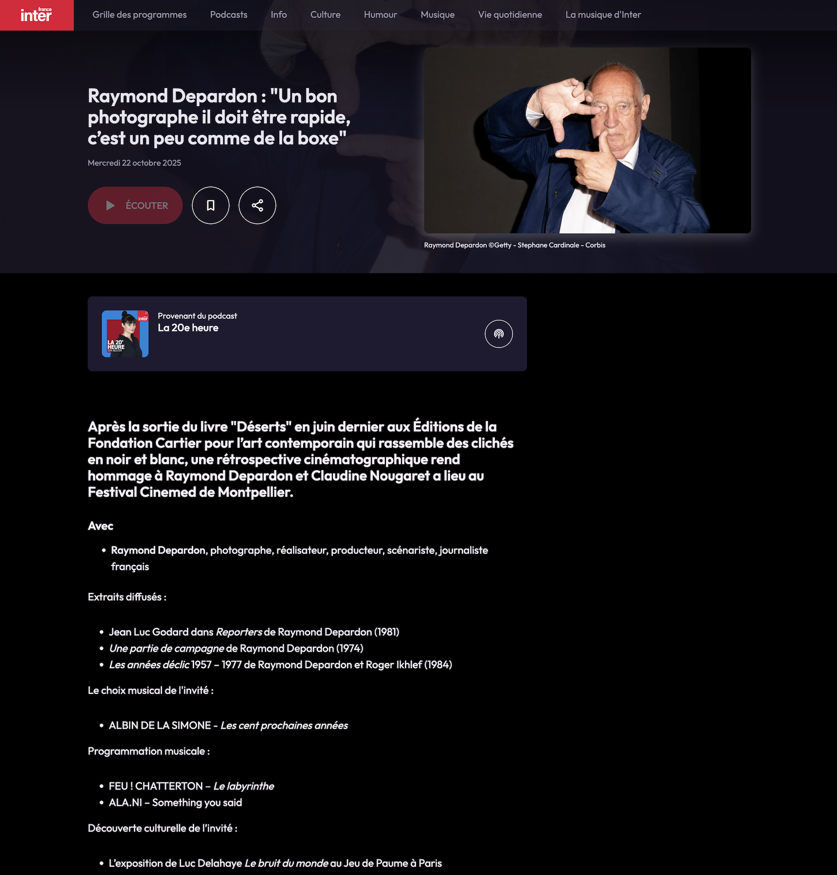 Raymond Depardon 'Un bon photographe il doit être rapide, c’est un peu comme de la boxe' - FranceInter